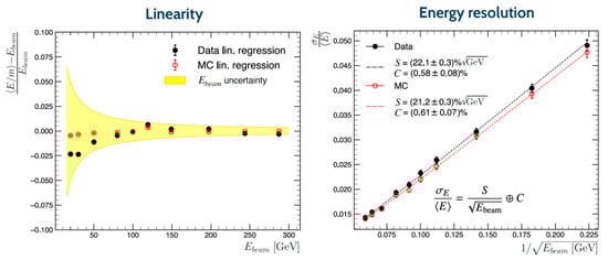 Energy linearity (left) and resolution (right) as a function of incoming electron beam energy measured in 2018 campaign.