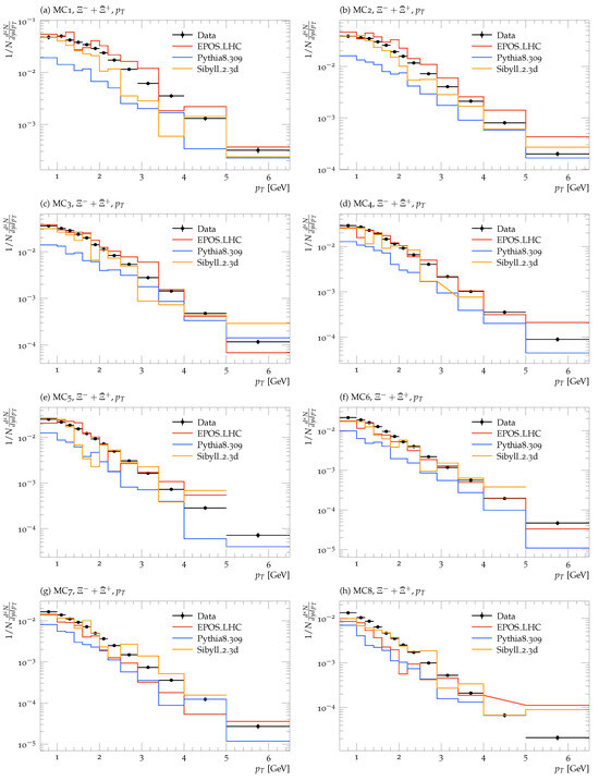 2. Mid-Multiplicity Classes (MC4–MC7): (a) EPOS-LHC (Figure 3d–g) achieves very good agreement with data in MC4–MC6, where hydrodynamic collectivity and initial-state strangeness balance. It underpredicts in MC7 as thermalization diminishes. (b) PYTHIA8 (Figure 3d–g) discrepancy reduces with decreasing multiplicity (MC4–MC7), as sparse systems minimize rope hadronization’s baryon suppression. However, systematic underestimation persists. (c) Sibyll2.3d (Figure 3d–g) transitional behavior underpredicts high- in MC4–MC6 but begins overpredicting in MC7, reflecting its minijet model’s growing dominance in low-density regimes.
