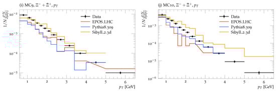 - Calcagni, L.; Canal, C.G.; Sciutto, S.J.; Tarutina, T. LHC updated hadronic interaction packages analyzed up to cosmic-ray energies. Phys. Rev. D 2018, 98, 083003. [Google Scholar]