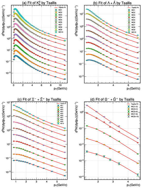 incorporates transverse mass (), effective temperature (), and non-extensivity parameter (q). Here, corresponds to the Boltzmann–Gibbs equilibrium, while signals deviations due to long-range correlations or incomplete thermalization. The distribution’s flexibility—spanning exponential () to power-law () behavior—provides insights into freeze-out conditions and production mechanisms [27,28,29,30,31,32].