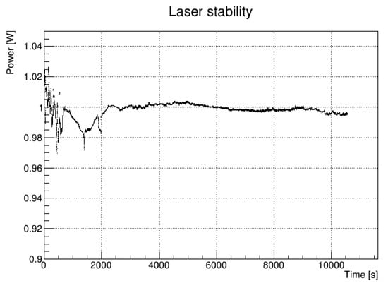 The laser source is a 808 nm GaAs laser, manufactured by Broadcom , directly connected to a graded index multimode optical fiber with a 62.5 µm core diameter and numerical aperture of 0.27 [5]. The laser wavelength was selected to be as far as possible from the SiPMs’ photon detection efficiency peak (500 nm [6]), ensuring good power and efficiency for our purposes. The laser output power can be tuned by means of the applied input current. We characterized the laser source at room temperature, in terms of linearity, power losses, and stability over time, recording information from an additional connected optical fiber. To prevent possible light leakage, we used a graded index optical fiber with a 62.5 µm core diameter and numerical aperture of 0.27, with a black reinforced 3.8 mm diameter Furcation Tubing. Furcation Tubings consist of an outer PVC jacket, KevlarTM protective threads, a polypropylene inner fiber tube, and a pull string for fiber insertion. The KevlarTM threads that surround the inner tube protect the fiber from damage by cushioning any impact incurred by the PVC outer jacket. The jacket suffered no damage after various thermal cycles in liquid nitrogen. We measured approx. 4.5% power loss associated with the use of an FC/FC joint and the additional fiber. Registering the laser power for 2 h with fixed input power P0 ∼ 1 W, we found a quite stable output over time: with an average difference of Mean (P0 – Pi) = 17.1 mW, where Pi is the power registered at time i. We notice unstable behaviour during the first 30 min of operation; if we exclude this time from the calculation, we found the following: and Mean (P0 – Pi) = 15.9 mW (see Figure 2).