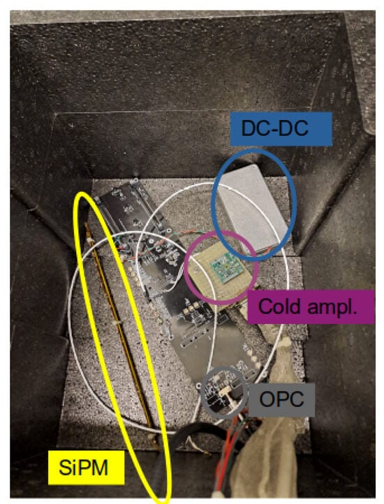 The OPC is mounted on the electronic board and its output voltage powers the SiPM cold amplifier, the DC-DC boost converter, and the SiPM.