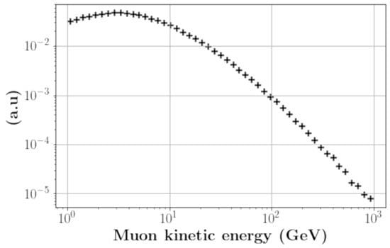 The distribution of atmospheric muons’ energy obtained at sea level through a horizontal surface with the CRY cosmic-ray particle shower library [7], the crosses represent the bin content.