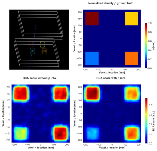 Some of these algorithms, like Angle Statistic Reconstruction [10], Binned Clustered Algorithm (BCA) [11], or momentum-aware POCA [12,13,14], can utilize momentum knowledge if available. To illustrate the impact of including the true momentum—as used in the simulations—in the density reconstruction, an example of a scattering muon tomography setup simulation is shown in Figure 2, with the predictions of the BCA with the true momentum—as used in simulation—and without any momentum information. Their performances are quantified through the mean squared error and mean absolute error of the normalized density prediction . The figure shows that including true momentum information during density inference not only reduces noise but also improves the quality of the inference. While the improvement depends on the algorithm, the integration of a momentum measurement system into any muon scattering tomography experiment is extremely relevant.