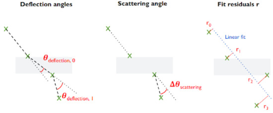 To have a direct comparison with Figure 4b, only the three scattering angles—as featured in Figure 4a—will be used as input. Similarly to the target, a operation is applied beforehand, and then they are preprocessed by removing the mean and scaling to unit variance. The result of the regression in Figure 5a shows that the DNN is able to exploit more information from these mere three inputs than Equation (4). There might, however, be more variables we can extract from the hits, for example, the deflection angles and the track residuals, as illustrated in Figure 6. When these features are added into the regression, while keeping the same model, , and preprocessing, the gain is significant, as illustrated in Figure 5b.