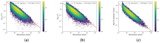 Together with Equation (4), the scattering angles’ standard deviation provides an estimation of the muon momentum, as illustrated in Figure 4b. The mismeasurement tail at low momentum originates from the fact that the muon energy loss through 4 cm of lead has the same order of magnitude as its momentum, for example, a 200 MeV muon loses about 55 MeV through 4 cm of lead. This could be circumvented by the use of Kalman filters, as demonstrated in Ref. [26].