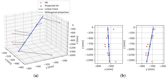 Representation of the muon’s deviations in 3D (a) and in and projections (b). The hits measured by the detector planes are used to fit a linear track and then projected onto that track.