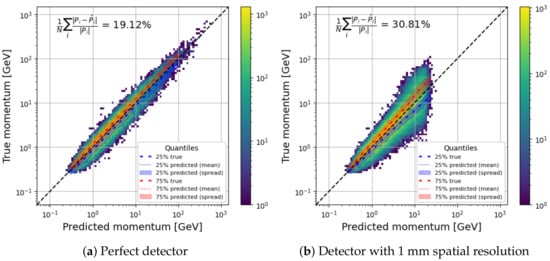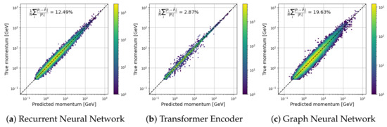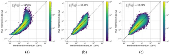 In order to be fed to an RNN, an order needs to be provided for the deviations. Fortunately, a natural choice consists of following the trajectory of the muon, in this case, from top to bottom. To exploit the azimuthal symmetry of the scattering in Equation (2), the track direction is used as the basis z-axis, with the deviations expressed in polar coordinates (r,) instead of Cartesian (x,y). This choice of cylindrical basis improved the regression performance when used with sequential algorithms. Additionally, to circumvent the logarithmic relationship with the momentum illustrated in Figure 6, the log-modulus function is applied on the magnitude of the deviation r, while preserving the angle. This function is used instead of a pure logarithm to avoid changing the sign of the deviation when , effectively “zooming” in on the high-energy muon while preserving the shape of the deviations, as illustrated in Figure A1. Finally, the tracks are rotated around their axes, so that the polar angle starts at . After passing through the RNN layers, the embedding of the last object is fed to a DNN in a many-to-one scheme. The result of the regression when the cylindrical coordinates (r,,z) are provided to the RNN is in Figure 9a.
