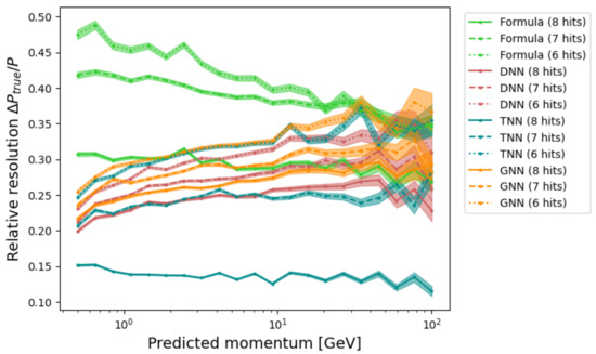 The relative resolution of different models as a function of the predicted momentum. Each ML model has been trained on a combination of datasets with 8 (all hits detected), 7, and 6 hits. In datasets with missed hits, the track fit, computation of angles in Figure 6, and deviations such as in Figure A1 and Figure A2 are performed with detected hits only. When two hits are missed, in around 50% of the cases the formula of Equation (4) cannot be applied as no scattering angle can be measured, and these muons are excluded.