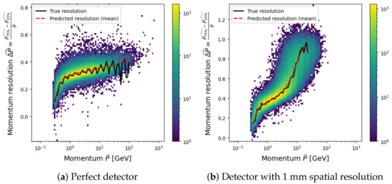Muon momentum regression using a DNN with a different set of features: only scattering angles (a); scattering angles, deflection angles, and fit residuals (b), as shown in Figure 6.