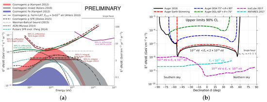 - Abdul Halim, A.; Abreu, P.; Aglietta, M.; Allekotte, I.; Cheminant, K.A.; Almela, A.; Aloisio, R.; Alvarez-Muñiz, J.; Yebra, J.A.; Anastasi, G.A.; et al. Investigating the UHECR characteristics from cosmogenic neutrino limits with the measurements of the Pierre Auger Observatory. In Proceedings of the 38th International Cosmic Ray Conference—PoS(ICRC2023), Nagoya, Japan, 26 July–3 August 2023; Volume 444, p. 1520. [Google Scholar] [CrossRef]