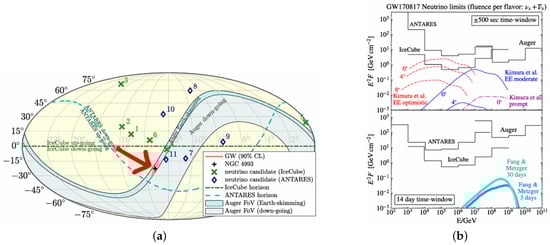 - Albert, A.; Andre, M.; Anghinolfi, M.; Ardid, M.; Aubert, J.-J.; Aublin, J.; Avgitas, T.; Baret, B.; Barrios-Marti, J.; Basa, S.; et al. Search for High-energy Neutrinos from Binary Neutron Star Merger GW170817 with ANTARES, IceCube, and the Pierre Auger Observatory. Astrophys. J. Lett. 2017, 850, L35. [Google Scholar] [CrossRef]