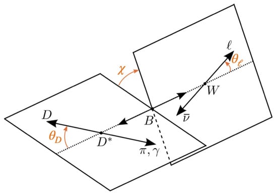 Semileptonic B-meson decays involving the transition are particularly sensitive to possible new interactions that violate LFU. Among these, the decay offers rich phenomenology through its angular distributions, enabling precise tests of LFU [,]. This decay is fully characterized by the recoil parameter w and three angular variables: , , and . The recoil parameter is defined as follows: