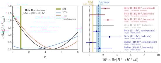 - Adachi, I.; Adamczyk, K.; Aggarwal, L.; Ahmed, H.; Aihara, H.; Akopov, N.; Aloisio, A.; Ky, N.A.; Asner, D. Evidence for B+→K+ν decays. Phys. Rev. D 2024, 109, 112006. [Google Scholar] [CrossRef]