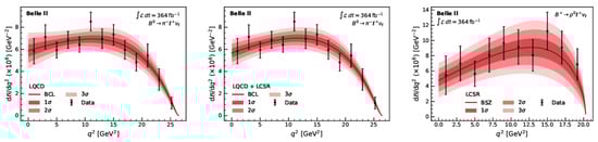 Ref. [] Measured partial branching fractions as a function of for (left,center) and (right). The fitted differential rates are shown together with the one-, two-, and three-standard-deviation uncertainty bands for fits using constraints on the form factors from (left) LQCD, (center) LQCD and LCSR, and (right) LCSR predictions.