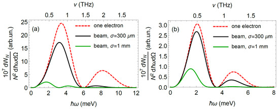 If , then the radiation has complete spatial coherence. This means that the spectral or angular distributions of GTR from a HEB are approximately times more intense than that from a single electron and have similar structures. If is of the order of , then the radiation is not fully spatially coherent, even though it has complete temporal coherence. For example, in Figure 2a, this case corresponds to the photons’ energy meV for the black line. Therefore, the spatially coherent radiation from a hollow electron beam demonstrates a significant change in the spectral characteristics compared to radiation from a single electron, i.e., with incoherent radiation. For the larger transverse outer radius of the beam , the spectral distribution of radiated energy changes significantly and loses its intensity; see the green lines in Figure 2.