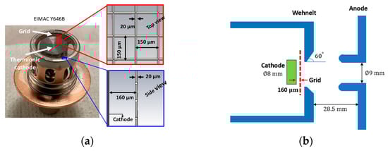 Figure 1. (a) Assembly of EIMAC Y646B thermionic gridded cathode (b) Electron gun geometry with the red arrows representing the cathode-grid gap distance (160 µm).