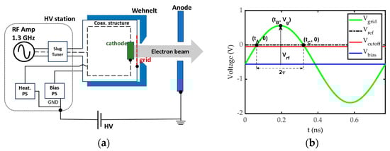 In the RF gating mechanism [21,22,23], the emitted electron beam is modulated by combination of RF and DC bias voltages for short bunch generation. This is achieved by using electron gun assembly, where DC high voltage (HV) is applied between the anode and cathode with HV power supply (PS). RF waves generated from RF source are fed in between cathode and grid space using coaxial structure. Additionally, a small negative DC bias voltage is applied across the cathode and grid using a bias power supply, as illustrated in Figure 2a. The resultant potential difference between the cathode and grid is described by Equation (1) and shown in Figure 2b: