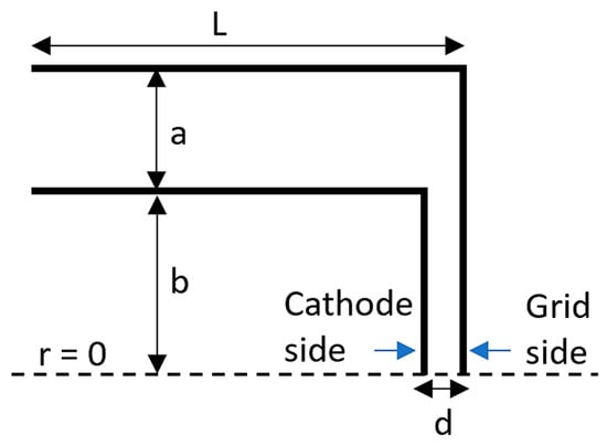Since a thermal energy of the electrons is usually of the order of millivolts (mV) and the negative V b i a s applied to the grid is of the order of volts (V), electrons from the cathode are allowed to emit and move toward grid only when V g r i d 0 . The condition satisfies for t A t t C . However, due to the leakage of the HV electric field through the grid, a small offset emission voltage V c u t o f f is introduced. This leakage causes electron emission to occur for a slightly longer duration than the intended emission area, as shown by the red line in Figure 2b. As a result, the emission occurs when V g r i d V c u t o f f , and leads to the Equation (2) at the extremes of the extended emission area.