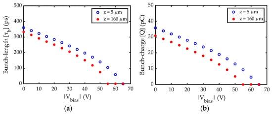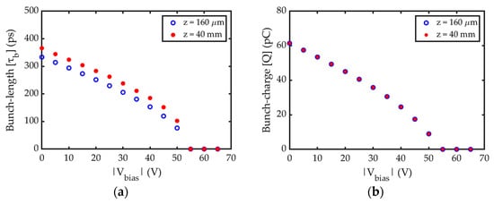 Figure 10. (a) Bunch-length and (b) bunch-charge at the grid (z = 160 µm) and downstream of the anode (z = 40 mm) for different V b i a s .