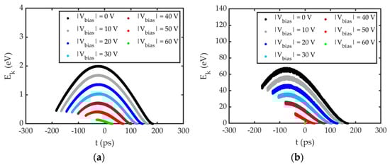 Our analysis reveals that combinations with higher | V b i a s | values produce shorter bunch-lengths. This relation can be understood from Figure 18, which demonstrates how the emission area for different | V b i a s | and V r f combinations (all yielding V g = 15   V ) becomes sharper with increasing | V b i a s | and V r f , resulting in shorter τ b . However, Figure 17 also demonstrates that increasing voltages lead to significant reduction in Q . This creates a critical trade-off between achieving shorter τ b and maintaining sufficient Q . The simulations performed in this section indicate that V b i a s > 50   V   with V r f > 65   V would yield the required Q and τ b < 148 ps, but would require J > 0.4   A / c m 2 and RF power more than 100 W.