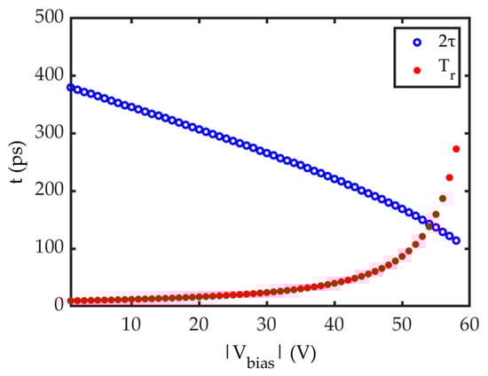 Figure 7. Electron acceleration time and the transit time for different | V b i a s | .