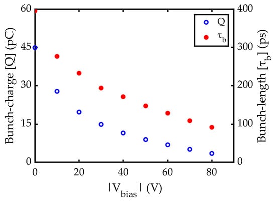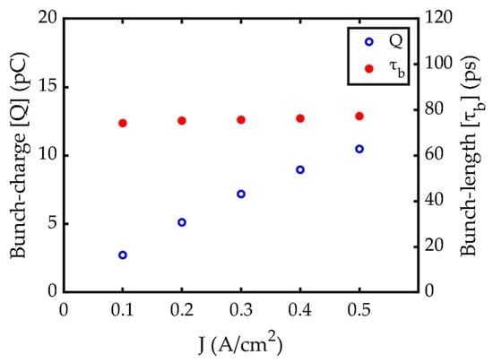 Figure 8. Bunch-charge and Bunch-length as a function of different emission current density of the cathode at | V b i a s | = 50   V .