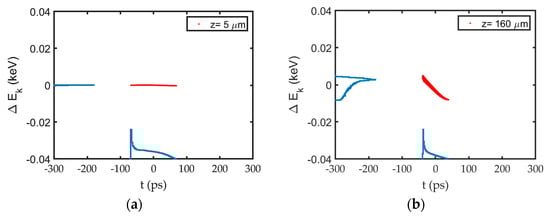 Therefore, a detailed analysis of the bunch evolution, including its behavior within the cathode-grid gap and further downstream to the buncher position, is performed for V b i a s = 50   V and current density of 0.4 A/cm2 in the following sections. For this analysis, the longitudinal phase space distribution is presented as Δ E k vs. time where Δ E k = ( E k ) i ( E k ) m e a n with ( E k ) i : kinematic energy of individual electron and ( E k ) m e a n : mean kinematic energy of the bunch.