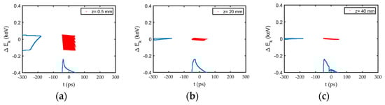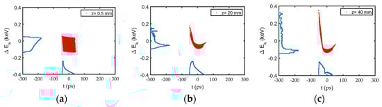 Figure 12. Longitudinal phase space distribution (with blue lines indicating the projections along the respective axes) for V b i a s = 50   V without space charge at (a) wehnelt position (z = 0.5 mm), (b) middle of the gun geometry (z = 20 mm) and (c) downstream of the anode (z = 40 mm).