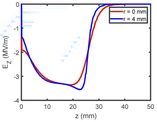 Figure 13. Longitudinal electric field due to HV along the axis and along the transverse position of 4 mm.