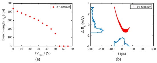 Figure 14. (a) Bunch-length obtained at buncher position (z = 500 mm) for different V b i a s , and (b) longitudinal phase space distribution for the optimal V b i a s = 50   V with blue lines indicating the projections along the respective axes.