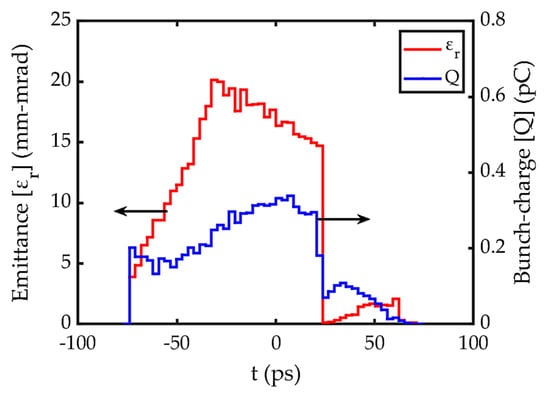 Figure 15. Transverse slice emittance (red) of the bunch and the distribution of bunch-charge (blue) within the bunch.