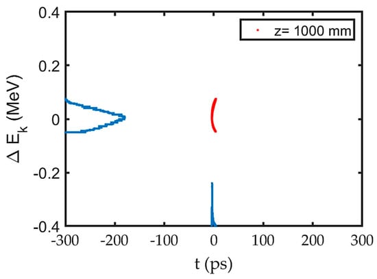 Figure 16. Longitudinal phase space distribution of the bunch for V b i a s = 50   V ,  downstream of the 3-cell buncher with blue lines indicating the projections along the respective axes.
