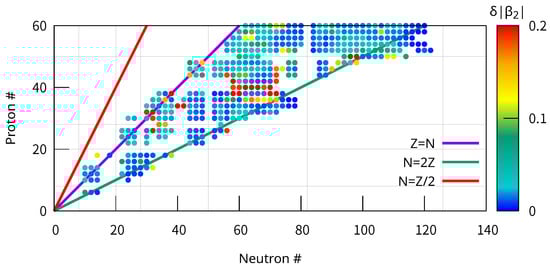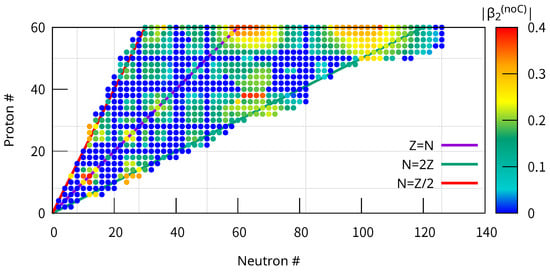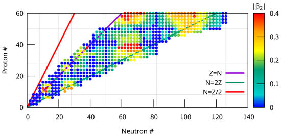 Deformation parameter of the calculated ground states of even–even nuclei with the SLy4 EDF including the Coulomb EDF. Those with positive two-nucleon separation energies (negative Fermi energy) are shown. The prolate and oblate shapes are not distinguished. The lines of , , and are shown for reference. The observed trend—that nuclei with magic numbers of nucleons are spherical, while those in the region of and exhibit larger deformation—is consistent with other studies of nuclear quadrupole deformation [39].