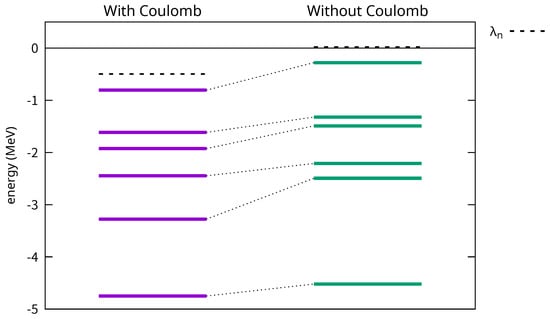 To examine the mechanism of the shift of the neutron drip line, we investigate the canonical single-particle energies of both protons and neutrons. The Coulomb interaction trivially increases the protons’ single-particle energies. In other words, the protons become less bound. In contrast, the single-particle orbits of weakly bound neutrons, shown in Figure 5 for 170Sn, decrease their energies. The neutrons are more bound. The 170Sn nucleus has a spherical shape and is one of the nuclei that are bound only when the Coulomb interaction is included. The inclusion of the Coulomb interaction lowers the energies by several hundreds of keV, which affects the Fermi energy , leading to an increase in neutron separation energy.