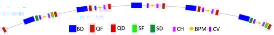 Figure 1 illustrates the schematic layout of one symmetric section, showing the placement of key magnetic elements: dipoles (blue), quadrupoles (red), sextupoles (green), correctors (pink), and beam position monitors (BPMs, orange). A summary of the booster magnet design parameters is provided in Table 1. With this configuration, a low beam emittance of 5.87 nm·rad can be achieved.
