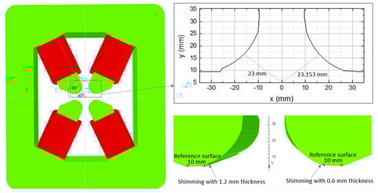 For fabrication purposes, the pole is shaped at a 65° angle with respect to the horizontal axis, while the pole tip is precisely maintained at 45° to ensure the desired field profile. The pole profile of this combined-quadrupole magnet is illustrated in Figure 2 (right). Initially, the pole shape is calculated using xy = ±R2/2, where R is the bore radius of 23 mm. The calculation is performed over the range x from −25 to 0 mm for the left pole and from 0 to 25 mm for the right pole. To achieve the desired sextupole field strength, the quadrupole pole profiles in the top two quadrants are rotated clockwise by 0.6°. To reduce the dipole field generated, the bore radius is adjusted to 23 mm for the right poles and 23.153 mm for the left poles. At the end of each pole, a shimming plate is added to locally enlarge the GFR. As shown in Figure 2 (right) in green, the left pole side is shimmed with a thickness of 1.2 mm, while the right pole side is shimmed with 0.6 mm. The top and bottom poles are shimmed symmetrically. To ensure precise magnet positioning, a reference surface along the x-axis at the pole should extend at least 5 mm. For this magnet, a 10 mm long reference surface, machined along the x-axis, has been provided to serve as a fiducial for accurate alignment.