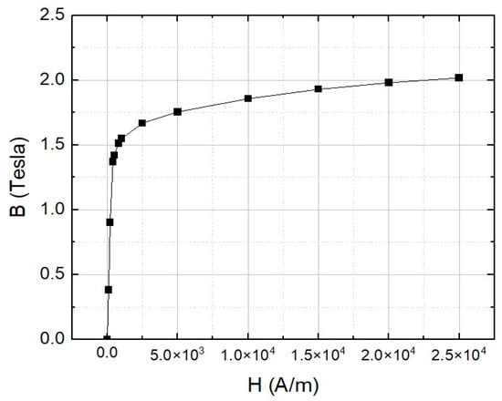 For the yoke material, the SPSII booster employs laminated steel magnets to minimize energy loss resulting when changing the magnetic fields during operation. Low-carbon–silicon electrical steel lamination of the Thyssenkrupp type is chosen as the laminated core material for nonlinear material properties of the magnet yoke with the isotropic property assumption; see Figure 3 for the B-H curve. In the simulation, a total potential type with a ‘Quadratic’ element was selected. For the magnet yoke, a suitable element size of 5 mm was chosen, acknowledging that while smaller sizes provide better precision, they also entail longer computational times.