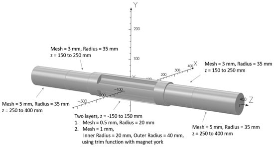 To perform magnetic field simulations using Opera-3D, it is necessary to configure the air condition. Optimal accuracy in the magnetic field simulation is achieved with a smaller mesh size for the air; however, this comes at the cost of longer running times. Therefore, it is crucial to strike a balance and optimize the mesh size. The air region is configured in the shape of a cylindrical structure, encompassing the specific area from which we intend to collect magnetic field data. In the case of the combined-quadrupole magnet, the mesh size is divided into four layers, detailed in Figure 4. In this case, the smallest mesh of 0.5 mm is positioned at the center of the magnet, utilizing data for the GFR and harmonic analysis. In the air region overlapping with the yoke, a mesh size of 1 mm is set. For improved accuracy, the cell properties of the air region are configured using the ‘Quadratic’ element type.