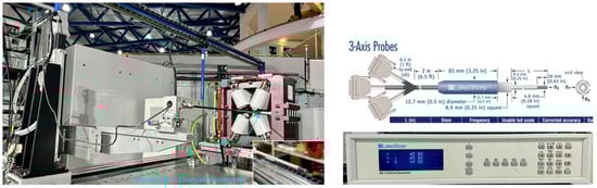 The magnetic field was measured using the Hall-probe technique, as shown in Figure 6. A Lake Shore three-axis Hall probe, in conjunction with a Model 460 Gaussmeter (Lake Shore Cryotronics, Westerville, OH 43082, USA) [15], was employed for the measurements. The system offers a measurement accuracy of ±0.25% of the reading for magnetic fields up to 2 T under controlled environmental conditions, typically maintained at 25 °C. The three-axis probe enables simultaneous measurement of all field components (Bx, By, Bz), ensuring reliable vector field characterization. Figure 6 illustrates the Hall-probe measurement setup, including the probe mounting configuration and positioning system. To address probe positional discrepancies, a centering procedure was performed prior to the magnetic field measurements to accurately determine the position of the Hall probe. This procedure involved scanning the probe along both the horizontal (x) and vertical (y) axes to locate the magnetic center of the vertical magnetic field. Based on this method, we are confident that the Hall probe was well-centered during the measurements.