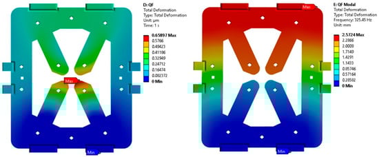 Figure 7 shows the results of the mechanical analysis, illustrating the magnet’s static deformation caused by the combined effects of magnetic forces and coil weight, as well as the total deformation obtained from the modal analysis. The simulation results indicate that the static deformation of the magnet structure is at 0.7 μm, which is well within acceptable limits for maintaining the required field quality. Additionally, the first-mode natural frequency of the structure was determined to be 325 Hz, which is sufficiently high to avoid resonance with operational frequencies and external vibrations that could impact magnet performance. These results confirm that the prototype magnet design is robust, with structural deformations and vibrational modes that are compatible with the operational requirements. Further optimization of the mechanical design may involve refining the support structure, enhancing the rigidity of the magnet assembly, and ensuring that all components are within acceptable stress and deformation limits.