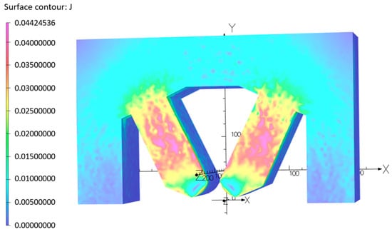 Figure 8 shows the simulated surface current density distribution obtained using Opera-3D at 0.25 s, corresponding to a beam energy of 3.0 GeV. The results indicate that eddy currents are primarily confined within the lamination planes, with peak concentrations near the magnet ends. The maximum current density, reaching 0.0442 A/mm2 at the pole tip, leads to localized power losses within the laminated steel yoke.