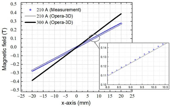 The vertical magnetic field along the x-axis (y = z = 0). Blue symbols denote the measured magnetic field using the Hall-probe technique. Gray and black symbols represent the magnetic field calculated using Opera-3D for coil currents of 210 A and 300 A, respectively.
