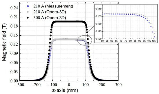 The vertical magnetic field along the z-axis (x = 10 mm, y = 0). Blue symbols denote the measured magnetic field using the Hall-probe technique. Gray and black symbols represent the magnetic field calculated using Opera-3D for coil currents of 210 A and 300 A, respectively.