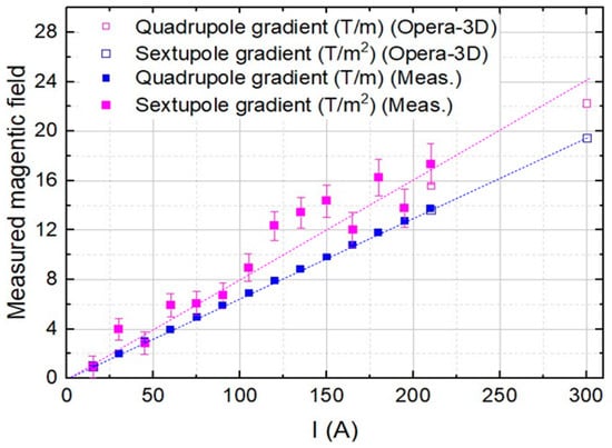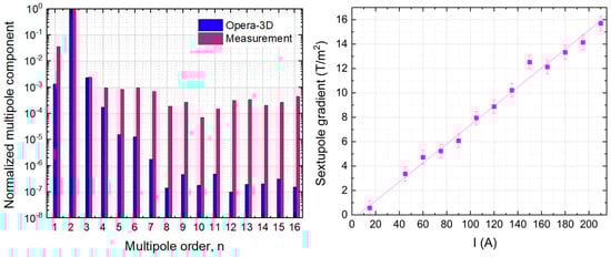 Figure 11 shows the quadrupole and sextupole gradients extracted from Hall-probe measurements. The quadrupole component, corresponding to the linear term in the polynomial fit, demonstrates good agreement with the simulation results, with measured values approximately 1% higher than predicted. In contrast, the analysis of sextupole gradients from the field measurements exhibits greater variation. A linear fit of the sextupole field versus the applied current reveals that the measured sextupole component is approximately 10% higher than the value predicted by simulation, as summarized in Table 3. The larger deviation may be attributed to factors such as mechanical misalignments, probe positioning errors, inherent noise in the measurement process, or the selected order of polynomial fitting. To improve the accuracy in evaluating the sextupole component, a multipole analysis based on the measured magnetic field data will be carried out, as presented in the following section.