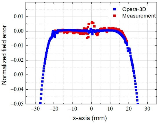 Normalized magnetic field error along the x-axis at the current of 210 A. Blue symbols represent the magnetic field calculated using Opera-3D. Pink symbols represent the measured magnetic field using the Hall-probe technique.