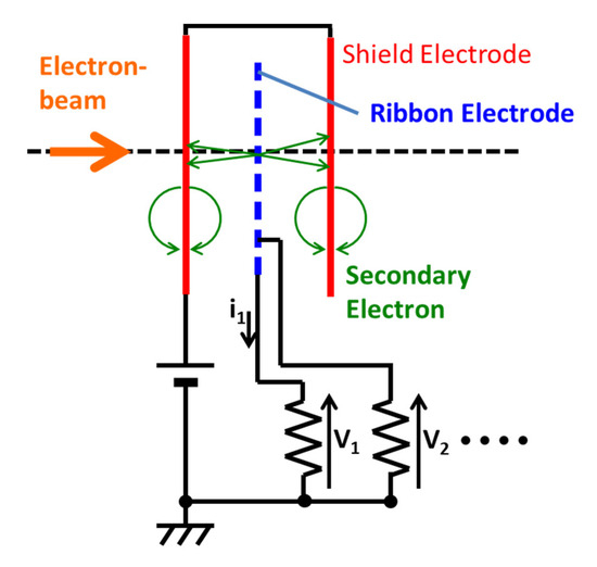 When high-energy charged particles strike a metal surface, they scatter and transfer energy to the electrons within the metal, causing these electrons to be ejected from the surface as secondary electrons. This phenomenon is known as Secondary Electron Emission (SEE). SEE has been utilized in measuring the beam profiles of charged particles [13,14,15,16,17]. SEE-based profile monitors are generally categorized into two types. The first is the wire scanner, which uses a single or a few wires with high-precision linear translation [14]. This setup allows for the measurement of very small beam sizes, down to the diameter of the wire itself. However, the wire should be scanned for reconstructing the beam profile then multiple shots are required for one measurement. The second type is the multi-wire or multi-ribbon profile monitor, which utilizes an array of many wires or ribbon electrodes [13,15,16,17]. The multi-ribbon configuration specifically enables real-time or single-shot measurement of the beam profile. The multi-ribbon-type 1D profile monitor, utilizing SEE (hereafter referred to as the SEE monitor), is schematically illustrated in Figure 3. As depicted, the SEE monitor for 1D profile measurement comprises a 1D array of electrodes and two thin-film shield electrodes. A positive bias voltage is applied to these shield electrodes. When the thickness of the shield and ribbon electrodes is thin enough and the kinetic energy of the incident charged particle beam is sufficiently high, the charged particle beam can pass through these three-layered electrodes without strong perturbation. Secondary electrons emitted from the 1D-array electrodes are collected by the shield electrodes. Similarly, secondary electrons generated by shield electrodes themselves are collected by the shield electrodes. An electric current flows through the external resistor, its magnitude is proportional to the amount of emitted secondary electrons in each 1D-array electrode. Since the yield of secondary electrons is directly proportional to the amount of incident charged particle beam on each 1D-array electrode, a 1D profile of the charged particle beam can be reconstructed from the voltage signals appearing across the 1D-array electrodes in single-shot.