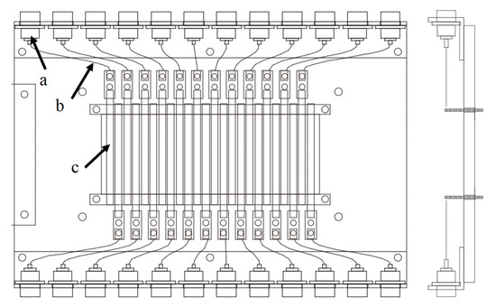 Assembly drawing of the ribbon-electrode mounting plate, ribbon-electrode, coaxial connector, and support jig for the SEE monitor (a: coaxial connectors, b: copper-wire, c: ribbon-electrode).