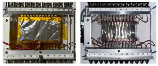 Figure 4 represents the schematic of the designed 1D-array-type SEE monitor. The ribbon electrodes are installed and connected to coaxial connectors via insulated copper wires. These ribbon electrodes are fabricated from 50-μm-thick, 3 mm-wide titanium strips. With 0.8 mm spacing between electrodes, they are capable of fully covering the 90 mm width. The two shielding electrodes are made of 11-μm-thick aluminum foil and are positioned to cover the ribbon electrodes. Due to space limitations, the device incorporates 12 coaxial connectors on both the top and bottom sides, with ribbon electrodes connected from both directions. Photographs of the shielding electrode and the ribbon electrodes are shown in Figure 5.