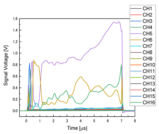 Initially, we performed a basic performance test of the 1D-array-type SEE monitor without FEL lasing. The excitation current of the dipole magnet was adjusted to be 14.6 A. The results are shown in Figure 7. The signal voltage from the SEE monitor was observed to be highest on channel #5, reaching approximately 1.55 V at 6.5 μs. This signal was significantly higher than environmental noise, which was measured to be around 4 mV. Consequently, the maximum S/N (signal-to-noise) ratio was calculated to be 388 (1.55 V/0.004 V). This confirms that the signal sensitivity of the array-type electrode SEE monitor is sufficiently high. Regarding the response speed of the SEE monitor, the system was able to capture fast transitions in the signal voltage, on the order of 100 ns, both at the beginning and end of the macro-pulse. Therefore, it was confirmed that the constructed system possesses a sufficiently high response speed to enable single-shot measurement of the extraction efficiency in KU-FEL.